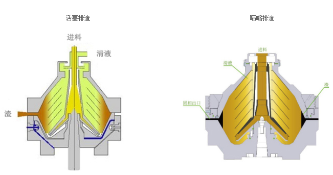 電機通過螺旋齒輪副驅(qū)動轉(zhuǎn)鼓繞主軸軸線做高速旋轉(zhuǎn),在轉(zhuǎn)鼓內(nèi)形成強大的離心力場。物料由上部中心進料管流入轉(zhuǎn)鼓底部,通過碟片分流孔趨向轉(zhuǎn)鼓壁空間。在離心力作用下,液相沿碟片內(nèi)錐面趨向轉(zhuǎn)鼓壁流動至上部的出液口排出。比液相重的固相物沉積向轉(zhuǎn)鼓內(nèi)壁形成沉渣,由排渣裝置自動排出機外或停機后由人工清除。