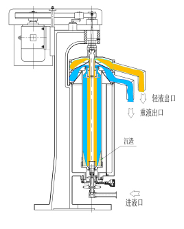 主軸帶動轉鼓繞自身軸線高速旋轉,在轉鼓內形成強大的離心力場。物料由底部進料口進入轉鼓內,在離心力作用下,迫使物料沿轉鼓內壁向上流動,并依其密度差沿軸向形成兩個同心液環(huán)。輕液由靠近軸心的輕液口排出,通過輕液集液盤回收,重液由靠近轉鼓壁的重液口排出,通過重液集液盤回收,微量固體渣沉積在轉鼓內壁上,停機后由人工清除。